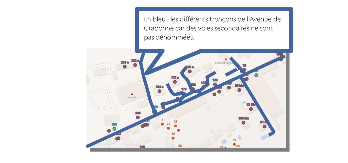 Sur cette capture d’écran de l’explorateur de la Base Adresse Nationale, les numéros de l’Avenue de Craponne se détachent par les cercles des numéros qui lui sont affectés : certains sont situés sur des voies perpendiculaires au tronçon alors que l’Avenue de Craponne doit rester un tronçon continu. Pour repérer ces discontinuités il suffit de consulter les adresses d‘une commune dans la Base Adresse Nationale. En sélectionnant un nom de voie, tous les numéros de la voie sont mis en évidence. S’ils ne sont pas alignés : vérifier s’il n’est pas possible de dénommer des voies d’accès.