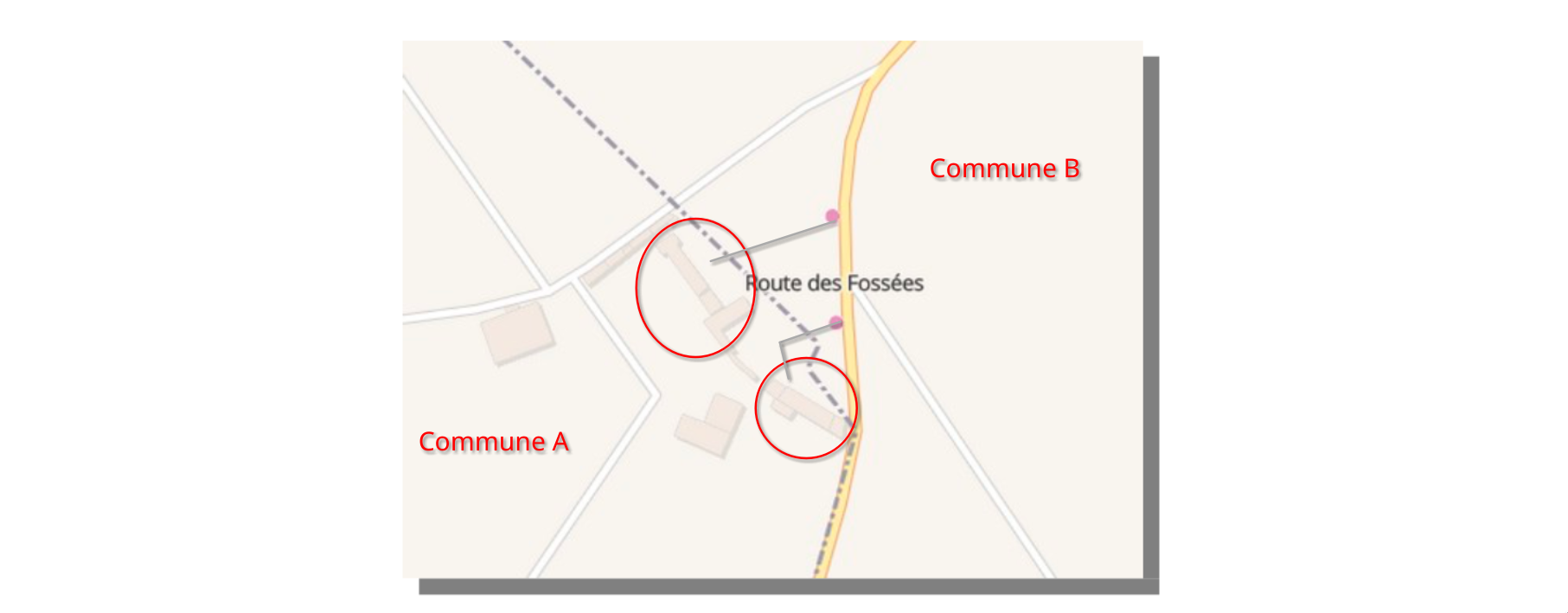 Il arrive que l’accès à une adresse se fasse par une voie qui ne fait pas partie de la commune. Dans ce cas, la commune s’entend avec la commune voisine : les deux délibèrent sur le nom de la voie, et la commune qui porte l’adresse prend également un arrêté pour le numéro. De la sorte, les services du cadastre pourront intégrer l’adresse avec le bon code INSEE de commune.