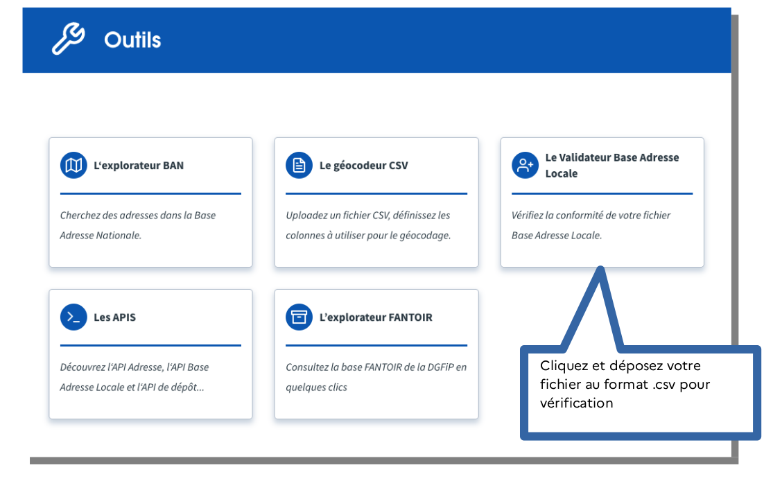 L’outil de vérification est disponible en ligne aux cotés d’autres outils plus avancés (géocodeur CSV, API d’Etalab) et de la carte interactive qui recense les adresses référencées dans la Base Adresse Nationale