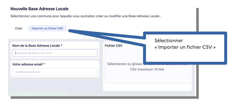 L’import du fichier CSV dans la Base Adresse Locale est réalisé sur la page d’accueil, en sélectionnant "Importer un fichier CSV" à droite de la case précochée "Créer" :
