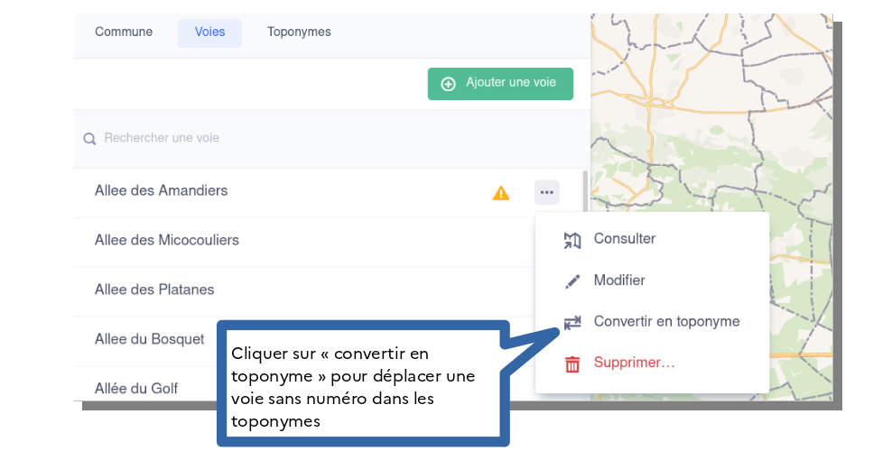 Tant que les numéros ne sont pas ajoutés, un triangle jaune reste affiché dans la liste des voies ainsi que la possibilité de « Convertir en toponyme » :