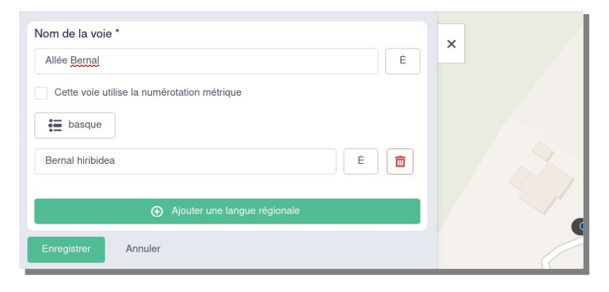 Dans la liste des voies (écran latéral), cliquer sur « Ajouter une voie » et préciser son nom en langue française, et ajouter sa version en langue régionale si elle existe. La nouvelle voie s’insère dans la liste suivant l’ordre alphabétique.