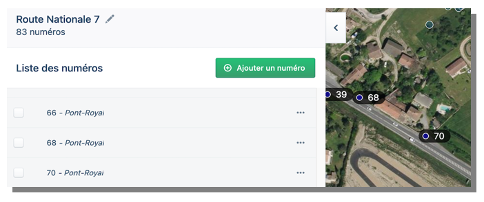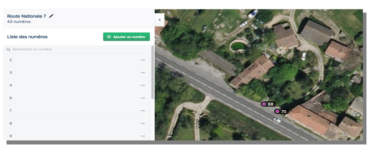 Pour créer un numéro dans une voie, cliquer sur les pointillés puis « Consulter » afin d’afficher les numéros dans la partie latérale de l’écran et sur le fond de carte en partie centrale. Un numéro peut être créé au choix :