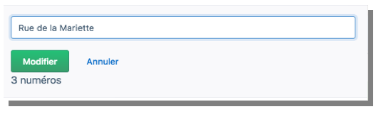 Le nom de la voie ou du toponyme est écrit en minuscules accentuées, la première lettre de la voie et du nom seulement étant écrites en majuscule. Dans la liste des voies, rechercher la voie dans le champ de recherche (outil loupe), cliquer sur les trois pointillés, activer l’outil crayon "Modifier" :