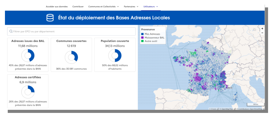 Voici le tableau de bord des Bases Adresses Locales centré sur la France métropolitaine publiées en date du 26 mai 2023, 12 619 communes couvertes :