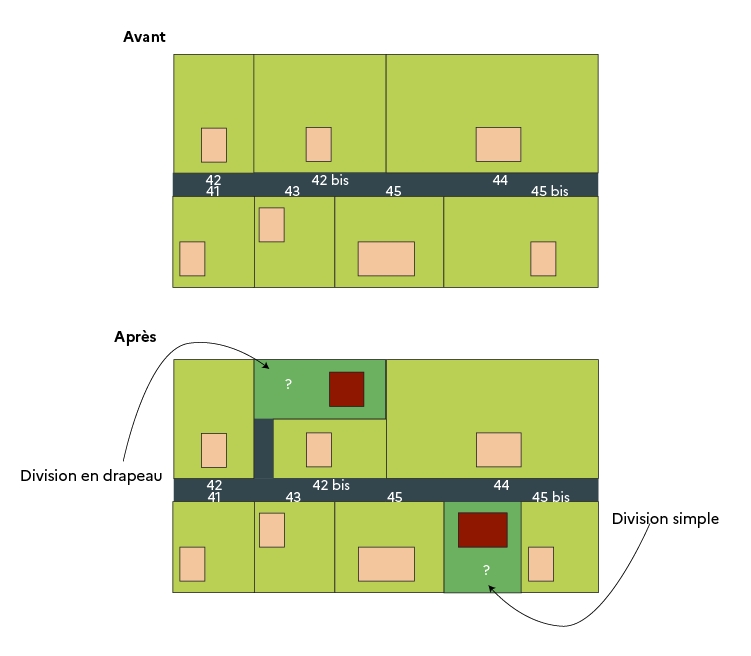 Problème : comment attribuer un numéro à une parcelle qui est située entre le 42 et le 42 bis ? Contexte complémentaire : cette situation est de plus en plus courante, notamment sur les parcelles dites en drapeaux.